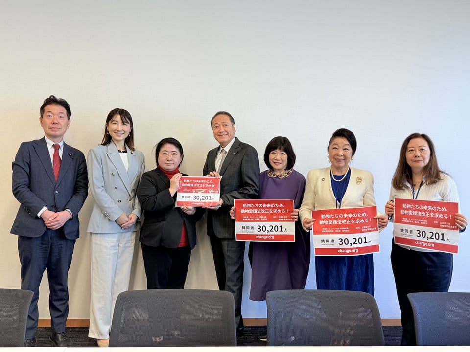 要望書では、イベント会場などで数日間だけ子犬・子猫の販売を行う「移動販売」の禁止や、幼い子犬・子猫の心身を守る「8週齢規制」の実効性確保、虐待下にある動物たちを迅速に救うための「緊急一時保護制度」の導入など10項目の法改正を求めています。