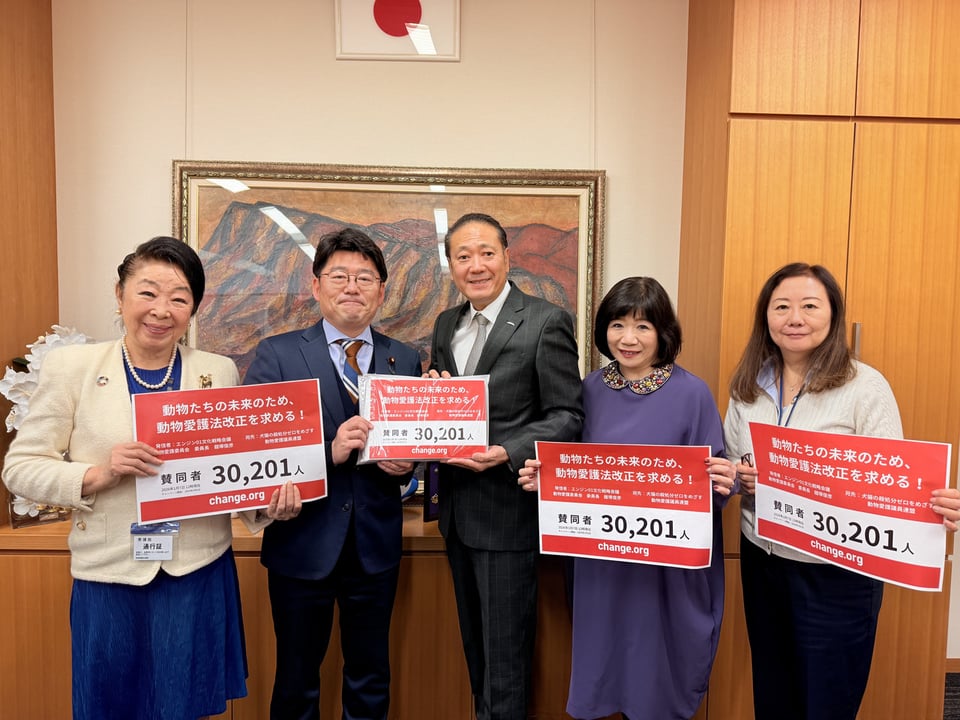 1月8日(木)、次の動物愛護法改正によって「真に動物を守れる法制度」が実現することを求め、多くの皆さんからいただいた署名3万201筆(1月7日まで分)を自民党動物愛護議員連盟 会長 鬼木 誠 衆議院議員ならびに立憲民主党動物愛護議員連盟へ提出してきました。